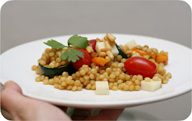as i expected, i loved this salad. i eat something like this about once a week (usually warm, though). i keep a well stocked pantry of couscous, jars of artichokes and roasted peppers, canned tomatoes, and pine nuts and prepare a one pot dinner when i just can't come up with anything more creative. with the grilled fresh vegetables, cheese, and whole tomatoes, this was a welcome change. you could definitely use a pasta or smaller couscous, but i am partial to the israeli style because it's hearty and fun to eat.
