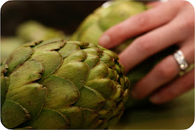 this was another 'step outside the box' food for me. while i eat artichoke hearts by the costco jar (true), my only experience with whole artichokes was one time in college. also important to note, that's probably the only story i have that includes, yeah i tried that one time in college. unless you count the time i went to an insane riot (much larger and more dangerous than our recent superbowl one, let me assure you) and was shot at with tear gas and rubber bullets. let me be clear, i was not rioting and i do not support riots...but that was a once-in-a-lifetime, college type thing that i couldn't pass up. anyway, back to college artichokes. husband and i boiled them and ate the leaves dipped in melted butter. it was meh, so i hadn't made them again until now.