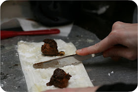 8. place a stuffed fig, slit side up, in the center of the rectangle