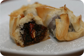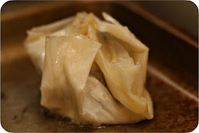 while it might seem like a lot of steps, the recipe is quite easy. if you've never used phyllo, this is a forgiving way to try it out. the bundles don't have to be perfect, they just have to contain the goodness.