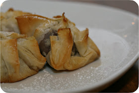 I can't imagine liking those, since I eat only phyllo dough and that by the fist full, but you make them look delicious! I also love the look of the four little round-mitered (I'm sure there's a name for it) pictures in the middle. Super cute design la.