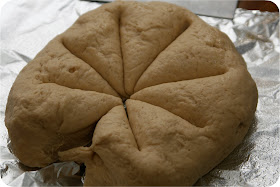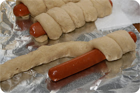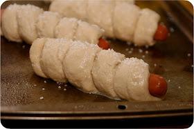 i mixed up the dough (cannot remember the ingredients, but you can find mixes in the store or you really can make your own) and let it rise. then i rolled it out into long, thin ropes and wrapped each hot dog from end to end. i coated them with the instructed baking soda/water wash (you'd dip whole pretzels in this, i guess), added the included salt, and baked until golden. sandra lee, watch out.