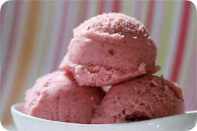 and oh my, was it ever delicious. it isn't like store bought frozen yogurt, where you've really got to convince yourself it tastes "just as good" as ice cream. i was surprised by how pink and "strawberry-y" this was. you know when you eat a strawberry candy and the flavor is so strong it seems (is?) fake...well this was similar in a fantastic way. perhaps candy makers have figured out the strawberry flavor. after every bite i had to tell myself, no, no, it was just strawberries, sugar and yogurt...no flavorings, no colorings.