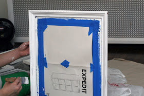 i skipped the initial sanding step (because i am lazy) and went straight into two coats of paint. i used fine sand paper to clean up the edges and to rub in some wear to various parts of each frame. husband used his strength to screw in the eyes and i strung some picture wire along the back.