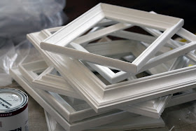 i found these frames at a thrift store and was so lucky that they were without backing and priced between 50 cents and two dollars. i scooped up a whole bunch and found a matching mirror for a whopping three dollars. i bought a small can of white paint on sale, some picture wire, and a few eye screws.