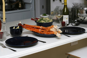 and so we prepared the risotto and in the last few minutes, we steamed the crab legs. we don't, however, have a proper pot in which to steam and the result of our efforts was hilarious. once finished, they barely fit on the serving platter. the one thing we do have for crab legs are tiny little forks. we used knives rather than crackers and because i am a semi-professional crab leg eater, i can get large chunks of meat out in this fashion.